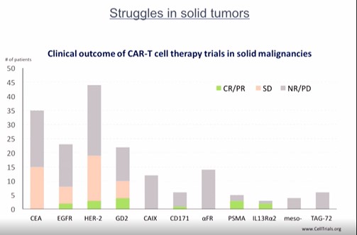 2017年以來,美國(guó)食品藥品監(jiān)督管理局接連批準(zhǔn)諾華公司的Kymriah 和 Kite 制 藥 的 Yescarta上市,使CAR-T 療法開始出現(xiàn)在大眾視野,并逐漸成為最具前景的腫瘤治療方式之一。近年 CAR-T在血液系統(tǒng)腫瘤治療,尤其是靶向CD19 CAR-T在急性難治型淋巴細(xì)胞白血病治療中,取得了矚目成就。然而,CAR-T在實(shí)體瘤的攻堅(jiān)上仍處于一個(gè)初期階段。按照雷博士的話說,為數(shù)不多的靶點(diǎn),腫瘤微環(huán)境、腫瘤異質(zhì)性、On Target Off-tumor所導(dǎo)致的副作用都是限制CAR-T療法在實(shí)體瘤領(lǐng)域發(fā)揮的重要因素。
