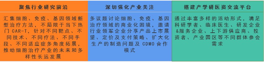 本屆大會誠邀國內(nèi)外領(lǐng)先學(xué)術(shù)科研機構(gòu)、大型醫(yī)院、產(chǎn)業(yè)鏈上下游企業(yè)、國家監(jiān)管機構(gòu)、產(chǎn)業(yè)園區(qū)、投資機構(gòu)、行業(yè)協(xié)會等專業(yè)人士共聚上海,分享行業(yè)進展動態(tài),探討產(chǎn)業(yè)發(fā)展瓶頸及細胞治療和基因治療的未來之路!