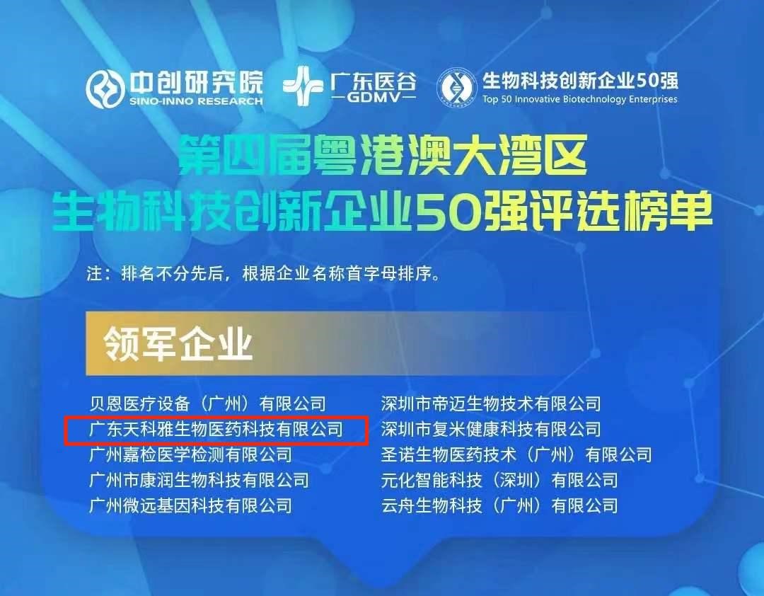 2021年12月29日,第四屆粵港澳大灣區(qū)生物科技創(chuàng)新企業(yè)50強頒獎典禮暨生物科技創(chuàng)新發(fā)展峰會將于廣州南沙舉辦,現(xiàn)場進行第四屆粵港澳大灣區(qū)生物科技創(chuàng)新企業(yè)50強頒獎典禮,天科雅榮獲“第四屆生物科技創(chuàng)新企業(yè)50強-領軍企業(yè)獎”。